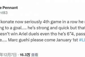 彭南特寫道:“我真是受夠科納特了,這已經(jīng)是他連續(xù)第四場比賽犯錯導(dǎo)致失球了……他雖然身體強壯速度快,但僅此而已,技術(shù)簡直糟糕透頂,明明身高1米93卻連空中對抗都贏不了,傳球水平跟業(yè)余聯(lián)賽球員沒兩樣,格伊請務(wù)必在1月1日加盟利物浦?!?/p>
