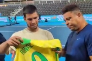 羅納爾多與西班牙網(wǎng)球選手阿爾卡拉斯打網(wǎng)球,兩人親切交流,羅納爾多還將自己的巴西隊(duì)9號(hào)簽名球衣贈(zèng)送給阿爾卡拉斯。