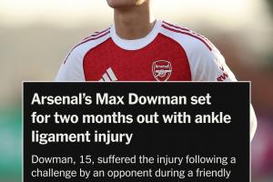 體育資訊12月10日訊 據(jù)TA記者奧恩斯坦消息,15歲阿森納小將道曼腳踝韌帶受傷,將傷缺2個月。