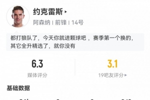 體育資訊12月14日訊 本輪英超,阿森納主場(chǎng)暫1-0狼隊(duì)。此役約克雷斯首發(fā)81分鐘被換下,球員全場(chǎng)重點(diǎn)數(shù)據(jù)如下↓