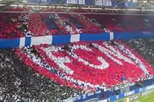 賽前沙爾克04球迷為歡迎來(lái)訪的紐倫堡,完成了一次精美的TIFO變換,1秒鐘由沙爾克04隊(duì)徽變成紐倫堡隊(duì)徽。