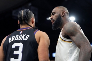 考慮到布魯克斯上次交手后針對勒布朗和湖人發(fā)表的言論,你本該預(yù)料到?jīng)_突會很早發(fā)生。通常情況下勒布朗會無視布魯克斯,但這個(gè)周日非比尋常,沖突在上半場升級,導(dǎo)致勒布朗在對位布魯克斯時(shí)領(lǐng)到了一次進(jìn)攻犯規(guī)。