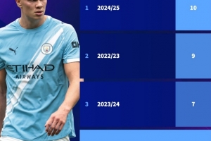 哈蘭德本賽季在前5輪英超打進(jìn)6球,但這已經(jīng)是他加盟曼城后前5場(chǎng)英超最低進(jìn)球數(shù)據(jù),他在24/25賽季同期10球,22/23賽季9球,23/24賽季則是7球。