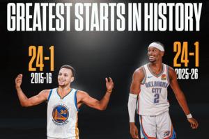 雷霆目前3場2負,值得一提的是,15-16賽季的勇士也出現過3場2負(客場輸給掘金和活塞)。