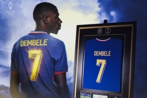 體育資訊12月20日訊 據(jù)法國足協(xié)官方在線商店顯示,為慶祝登貝萊榮獲2025年金球獎,官方推出了一款極其珍貴的聯(lián)名收藏品,帶有獨家金色印字的登貝萊裝裱球衣。