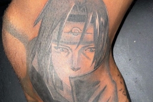 而在他的右腿膝蓋內(nèi)側(cè)的位置,還有一個宇智波鼬的頭像紋身。