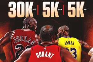 火箭官方也曬圖致敬杜蘭特這一偉大時刻,他們寫道:“又一項歷史被創(chuàng)造 ??杜蘭特成為NBA 歷史上第3快達成 30000+ 得分、5000+ 籃板、5000+ 助攻的球員。”