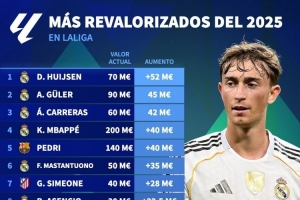 體育資訊12月24日訊 德國轉(zhuǎn)會市場列出了2025年西甲球員身價上漲排名,赫伊森上漲5200萬歐居首,居萊爾上漲4500萬歐次席。
