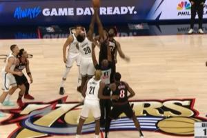 喬治把球投在籃脖子上,雙方跳球!