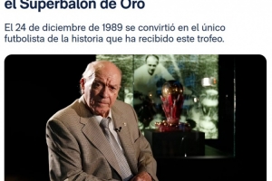 1989年12月24日,阿爾弗雷多·迪斯蒂法諾被授予超級(jí)金球獎(jiǎng),《法國(guó)足球》雜志以此向這位皇馬傳奇的偉大職業(yè)生涯致敬,他在最終評(píng)選中力壓克魯伊夫與普拉蒂尼,至今為此,《法國(guó)足球》只頒發(fā)過此獎(jiǎng)項(xiàng)一次,因此迪斯蒂法諾是唯一擁有此項(xiàng)榮譽(yù)的足球運(yùn)動(dòng)員。
