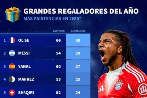 體育資訊12月25日訊 德國轉(zhuǎn)會市場統(tǒng)計了球員2025年俱樂部+國家隊的助攻次數(shù),并列出榜單,奧利塞30助居首,梅西29助次席。
