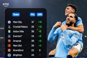 體育資訊12月25日訊 英超前17輪過后,轉(zhuǎn)播商亞馬遜統(tǒng)計了英超20隊本賽季相較上賽季圣誕節(jié)時(當時為16輪)的積分差距。