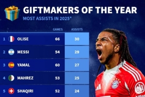 體育資訊12月25日訊 德轉(zhuǎn)官方社媒列出2025年度足壇助攻榜,拜仁球員奧利塞以66場30次助攻居首,邁阿密國際球員梅西54場29次第二。