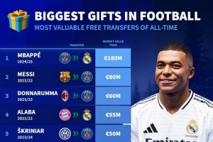 免簽球員德轉(zhuǎn)身價(jià)排名:姆巴佩1.8億歐居首,梅西8000萬(wàn)歐次席