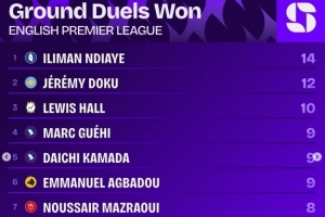英超第5輪贏得地面對抗次數(shù)榜: