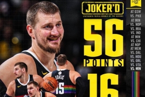 本場(chǎng),約基奇出戰(zhàn)43分鐘,投籃21中15,三分6中4,罰球23中22,砍下56分16籃板15助攻2蓋帽,正負(fù)值+15!