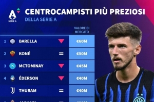體育資訊12月27日訊 德國轉(zhuǎn)會市場統(tǒng)計了意甲中場中路球員的身價,并列出榜單,巴雷拉6000萬歐居首。
