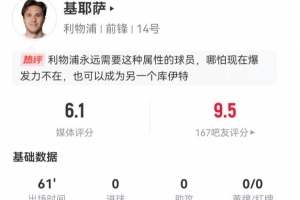 體育資訊12月28日訊 利物浦在本輪英超對陣?yán)顷牐举惣臼状卧诼?lián)賽首發(fā)的小基耶薩本場數(shù)據(jù)如下: